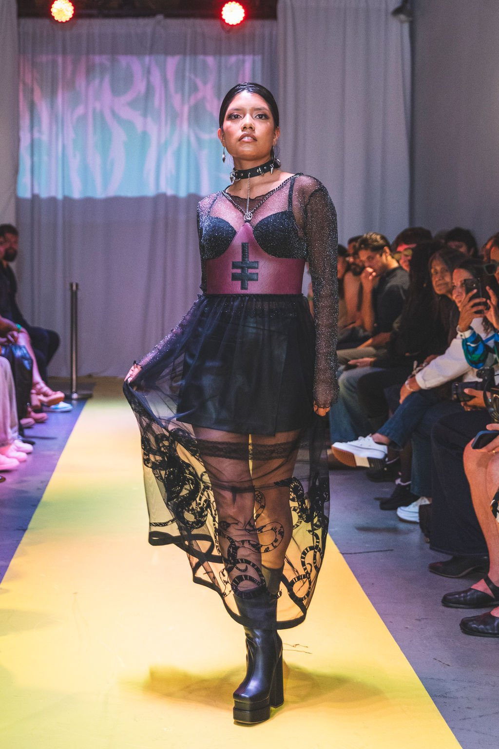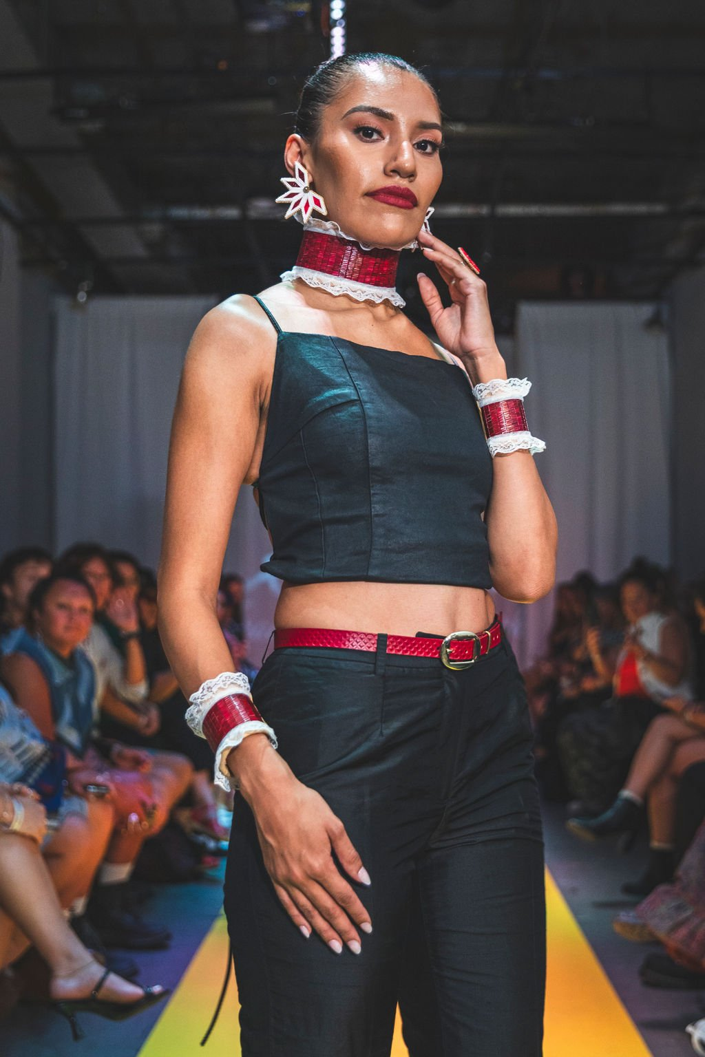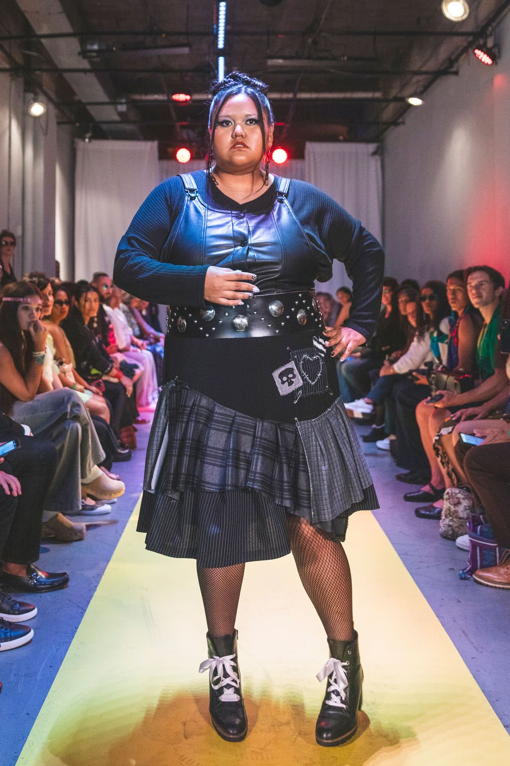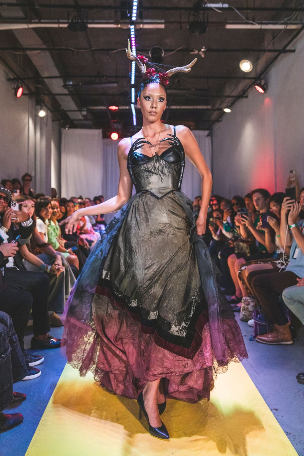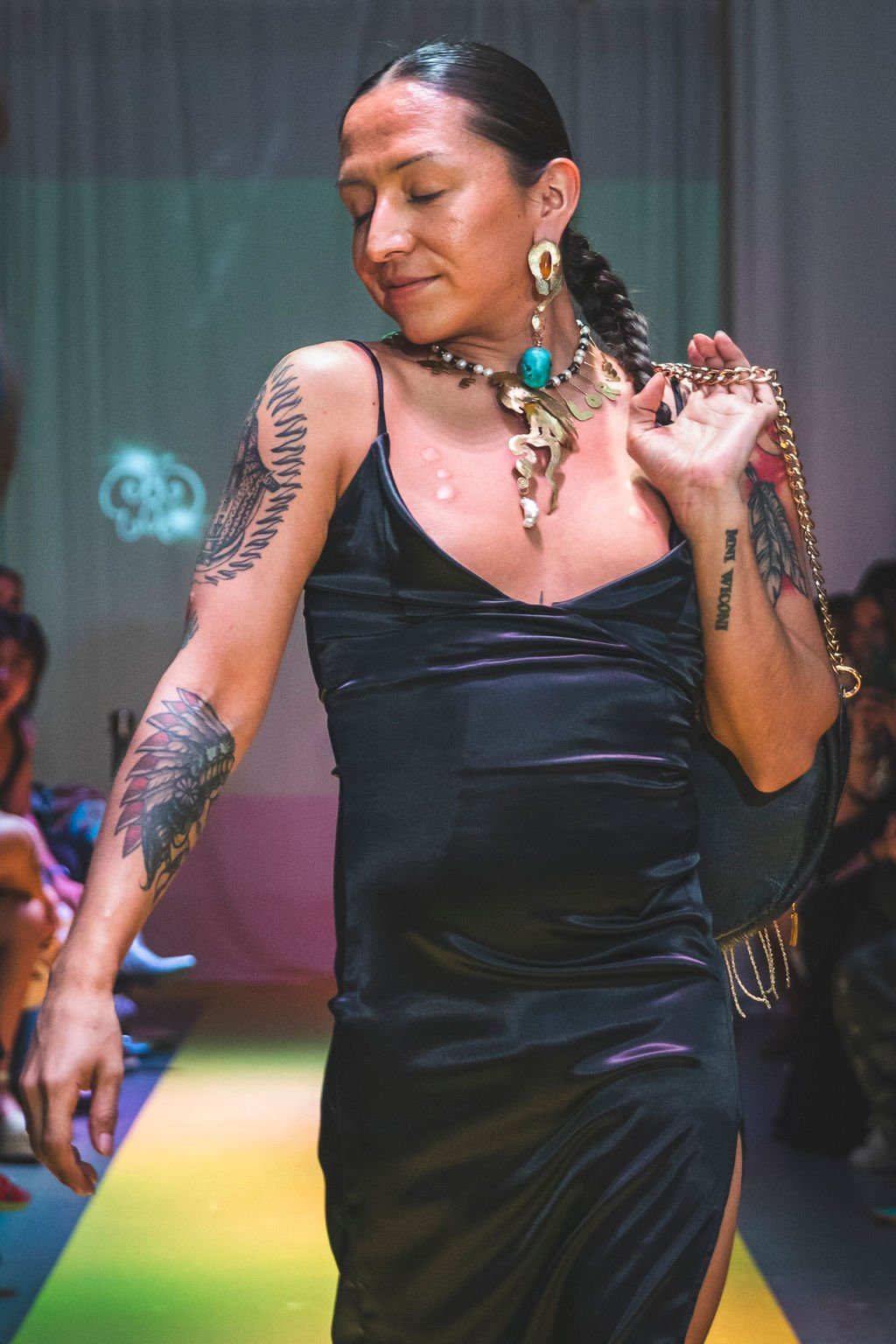 Taking a dark-romantic approach to the same ethos was Courtney Little Axe (Northern Cheyenne/Shawnee/Seminole) of ALTRN8V. She presented a provocative, punk and goth-infused collection of upcycled ready-to-wear. With Deer Lady as a guiding force, she transformed existing garments into bold new statements, proving that reverence for Mother Earth includes mindful sourcing and custom creations.