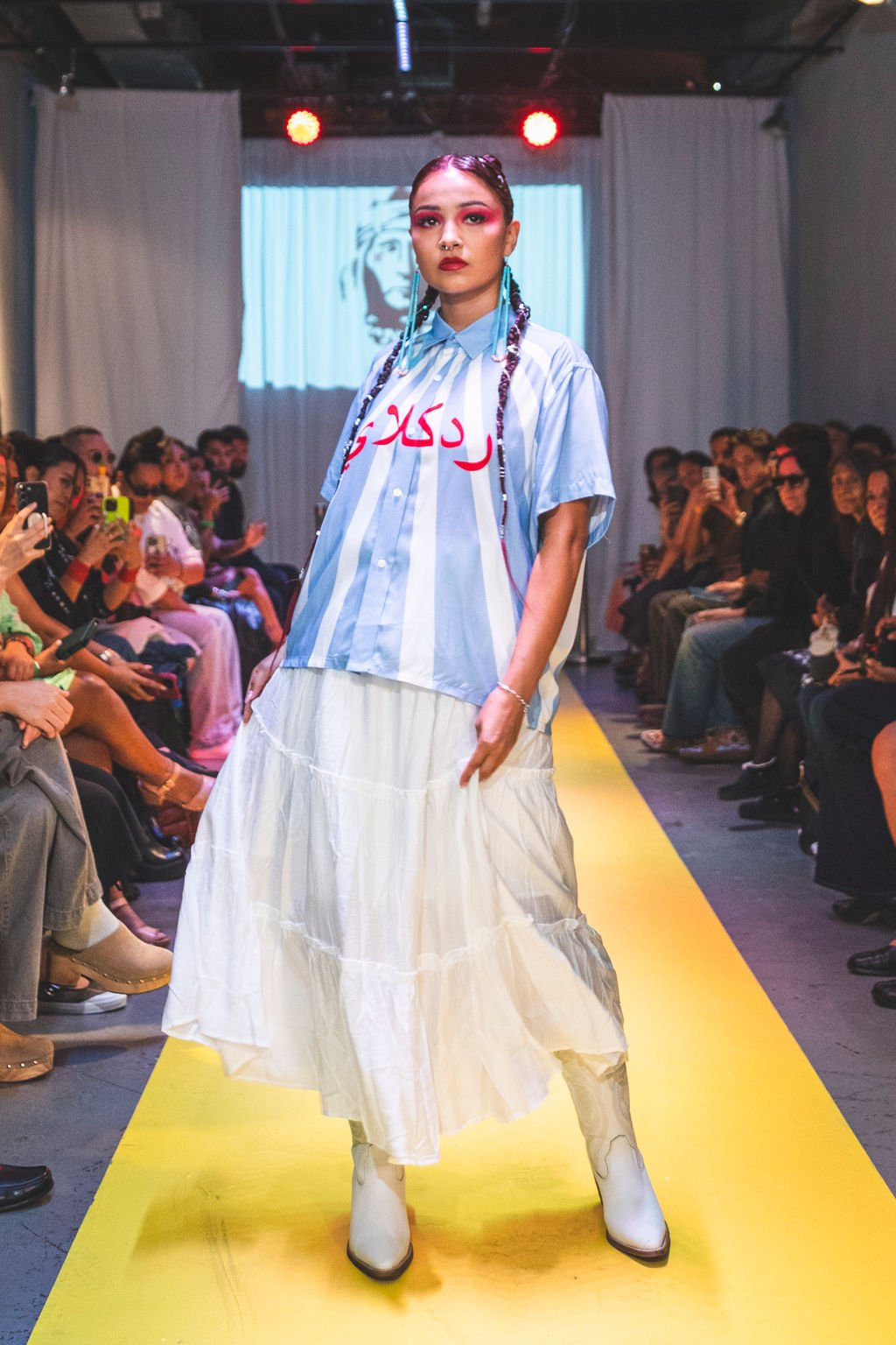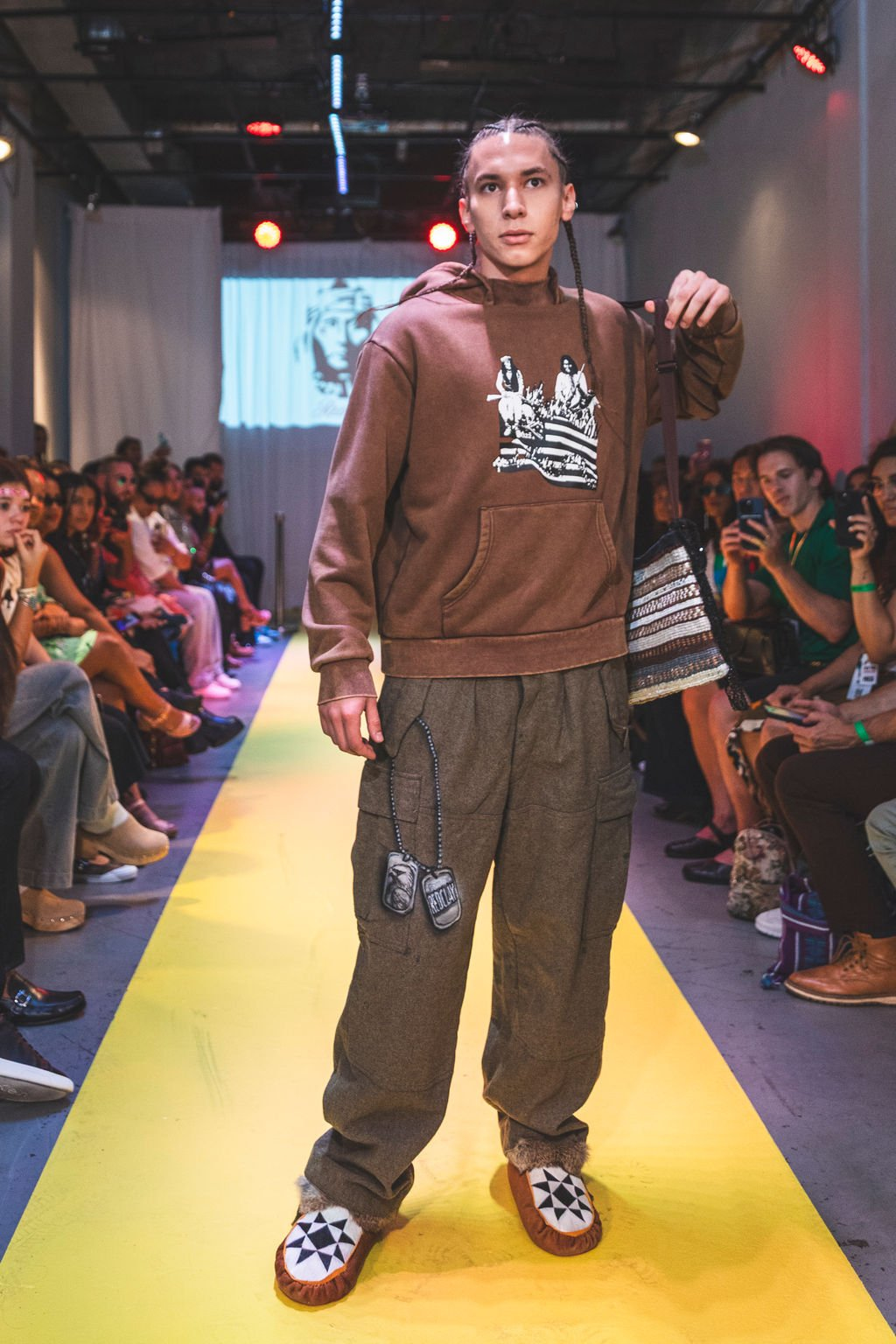 Red Clay, founded by Xade Wharton-Ali (Mescalero Apache), showcased an understated streetwear line designed to tell stories of resistance and displacement. With politically-charged graphics on hoodies and shirts, in a military-inspired color palette, his ensembles highlighted historical movements to foster pride in one’s heritage, aligning fashion with political awareness, showing that the principles of Indigenous self-determination are expressed through unwavering pride and defiant action.