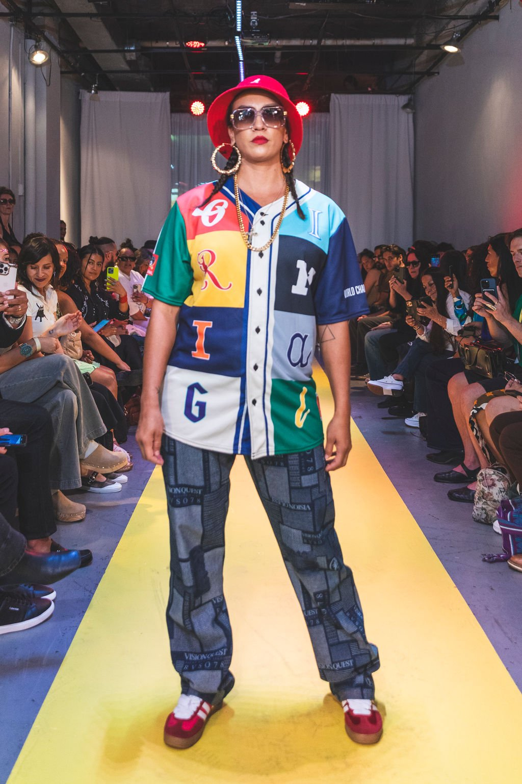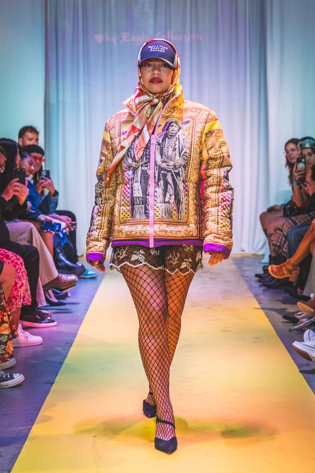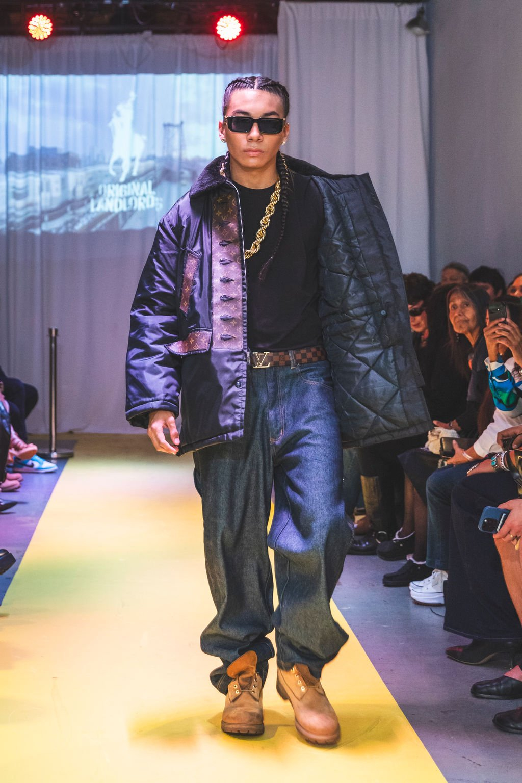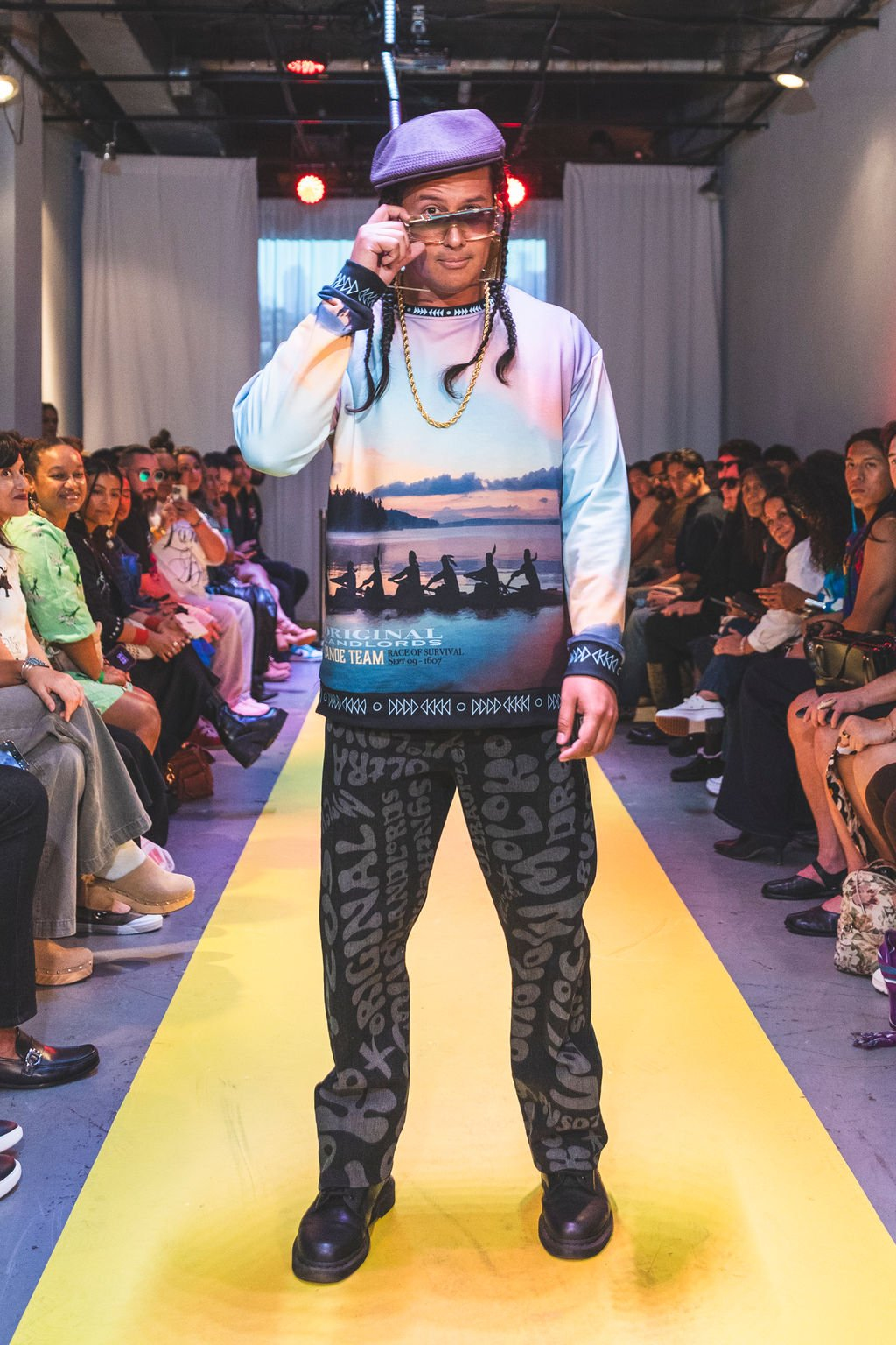 Known for his thought-provoking branding, Jeremy Arviso (Diné/Hopi/Akimel & Tohono O’odham) of Original Landlords led this charge by reimagining Hip-Hop streetwear with a Native twist. His collection featured vibrant oversized silhouettes and patchwork denim. The overall aesthetic celebrated cultural heritage with a strong Land Back sensibility, using motifs and graphics to assert Indigenous ownership and presence.