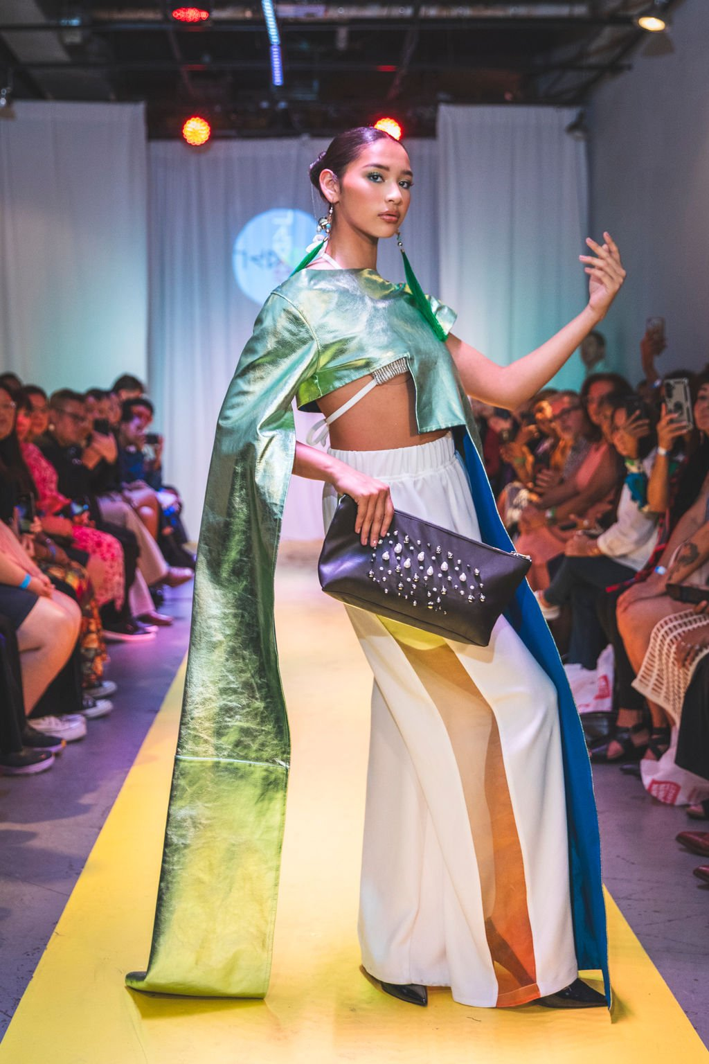 Jason Baerg (Métis) of Ayimach Horizons continued his rich narrative that began at Native Fashion Week Santa Fe, transforming ancestral knowledge into wearable art. His collection was a careful study in honoring the North, the element of Air, and the color White—all of which was captured in the ebb and flow of a collection that juxtaposed soft and hard elements through sculptural, intricate cuts and asymmetrical blocking,