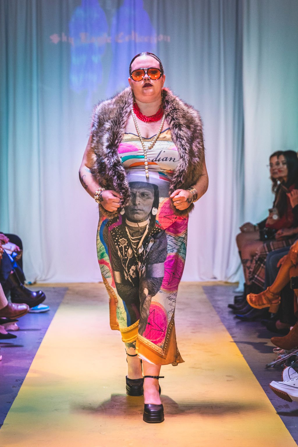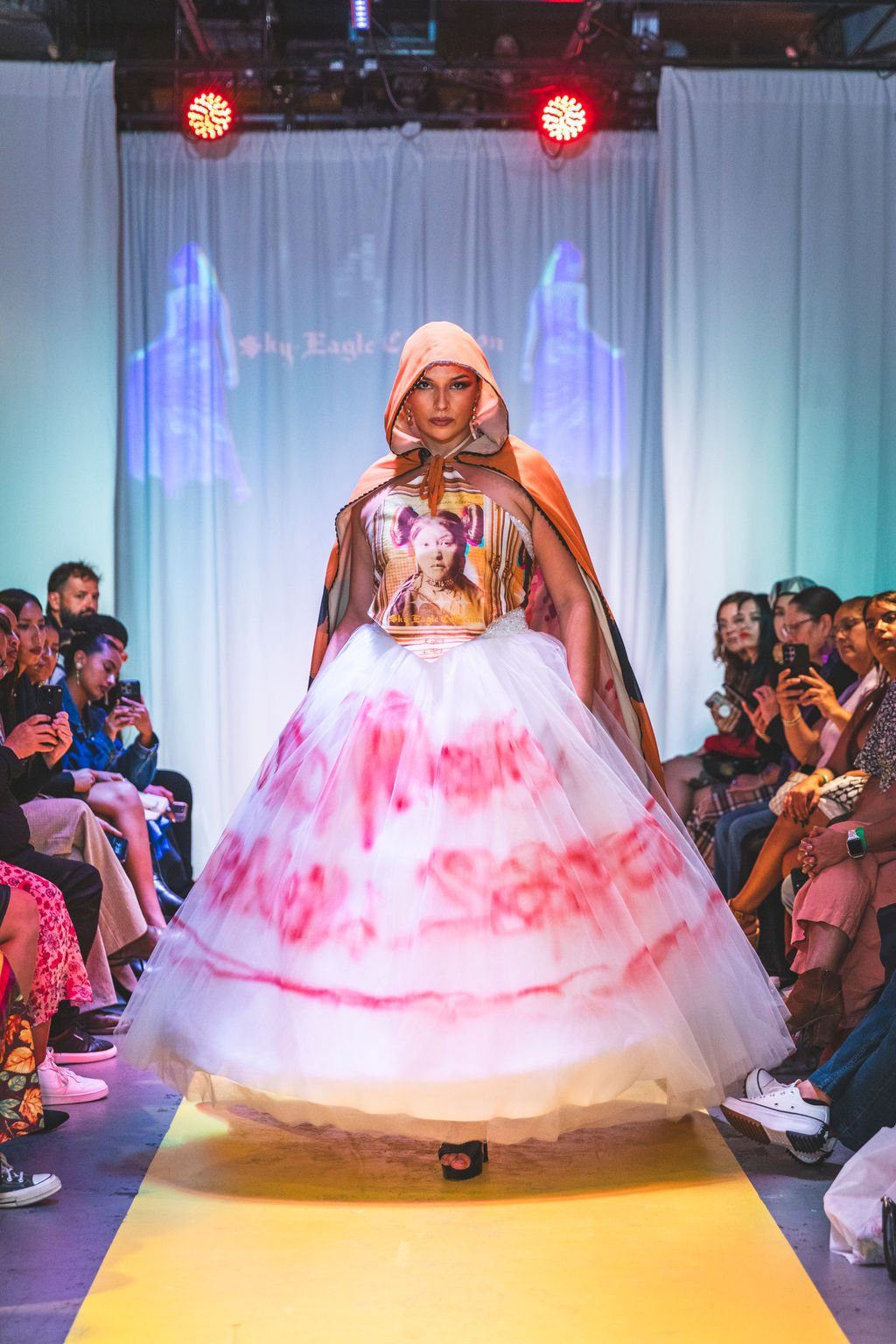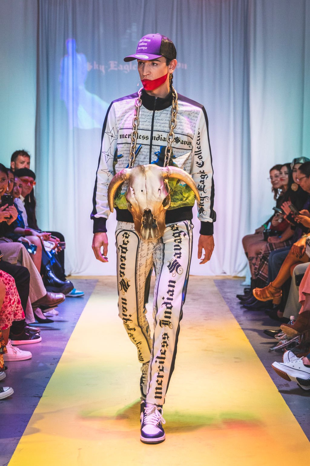 Dante Biss-Grayson (Osage) of Sky-Eagle Collection displayed a vivid, maximalist Ready-to-Wear line on the INYFW runway. Utilizing silk, jersey, and recycled post-consumer materials, the collection tackled the appropriation of Indigenous identity head-on, with garments that embraced the historically derogatory “Merciless Indian Savage” moniker within bold, graphic prints. This reclamation was paired with pieces that raised awareness of the Missing and Murdered Indigenous Peoples (MMIP) crisis.