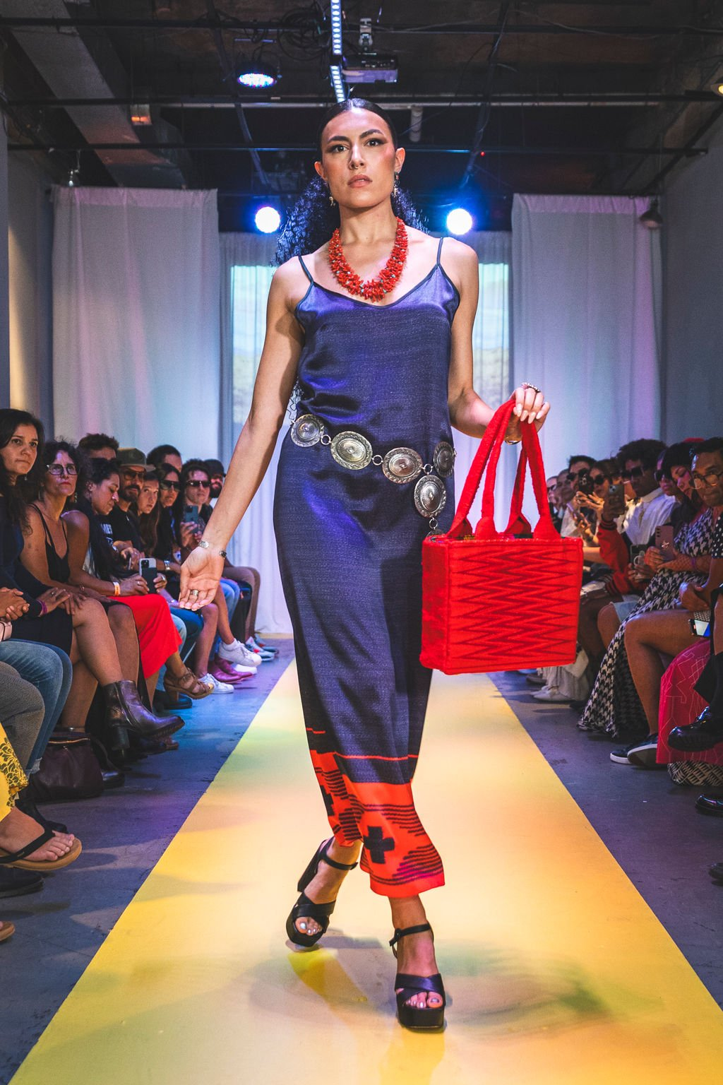 The three-day event hosted 25 shows, bringing together Indigenous creatives from across South and North America. The weekend kicked off with a jewelry showcase featuring pieces from designers such as Copper Canoe Woman (Nuučaan̓uɫ & Haíłzaqv), Joe Big Mountain (Mohawk/Cree/Comanche), and El Techichi Jewelry (Ñuu’savi).