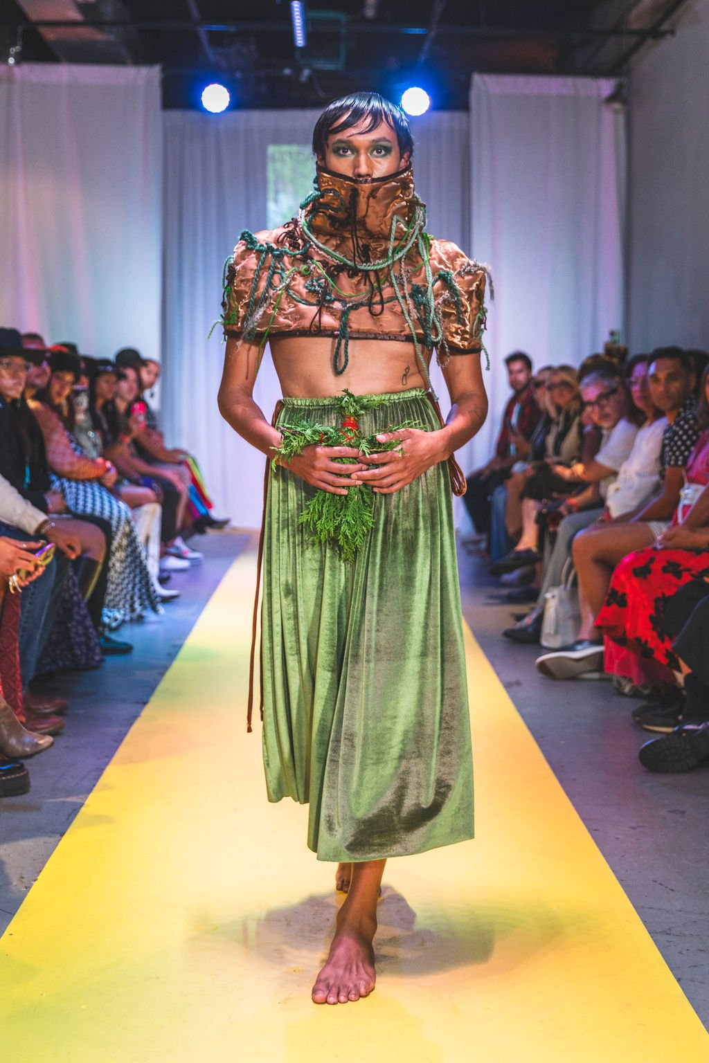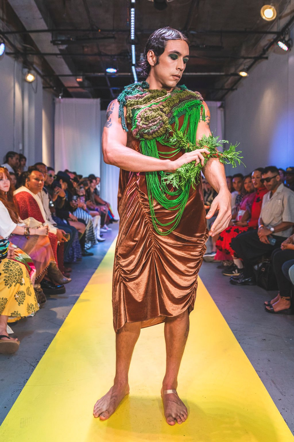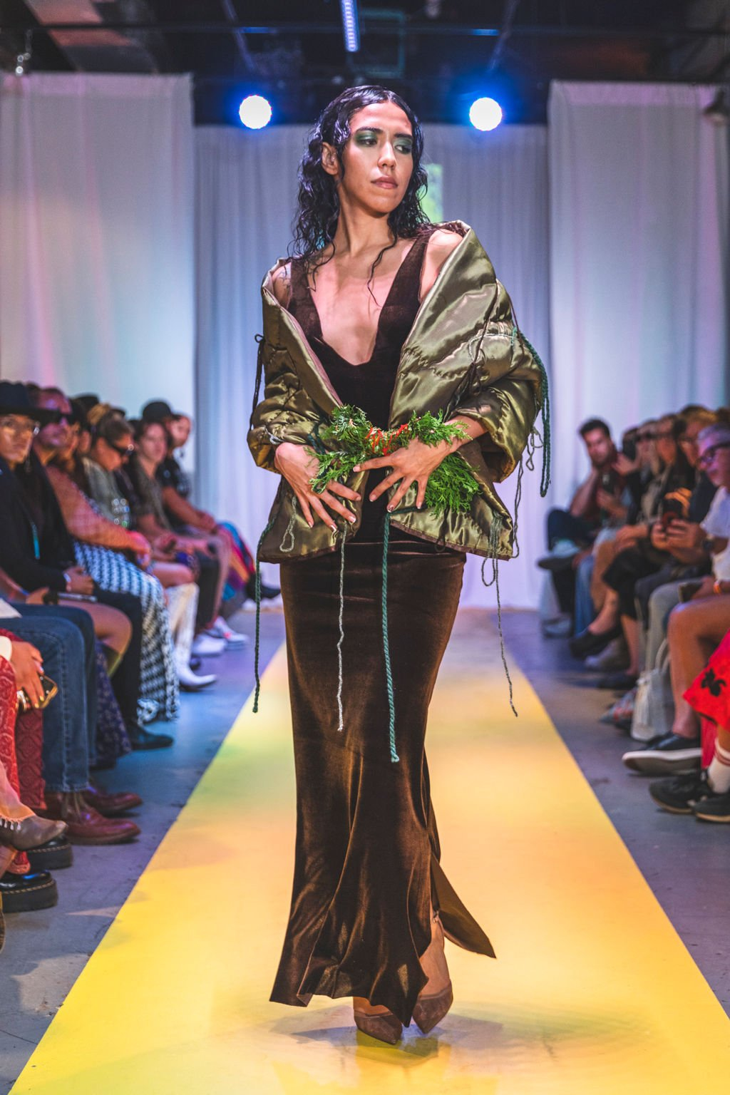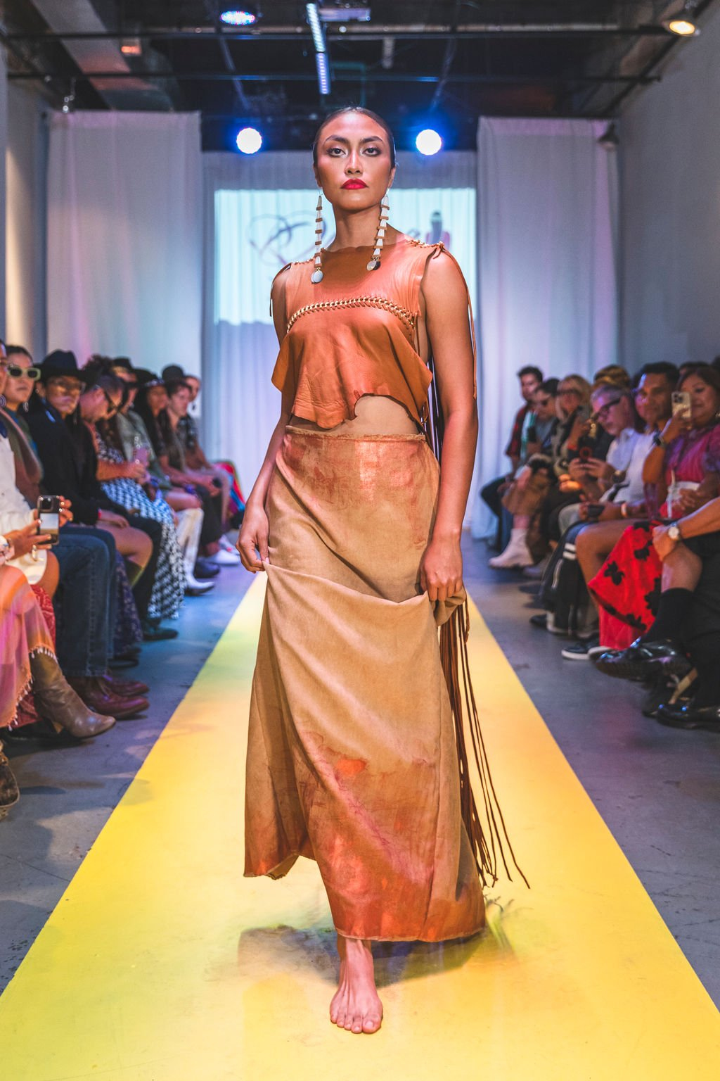 Sabrina Lombardo (Rarámuri/Tigua) of Native Nation Designs featured dramatic, draped silhouettes in earth tones—velvets and deep copper hues accented by mossy greens and raw textures. Each design embodied the brand’s commitment to ethical practice and embracing all gender identities.