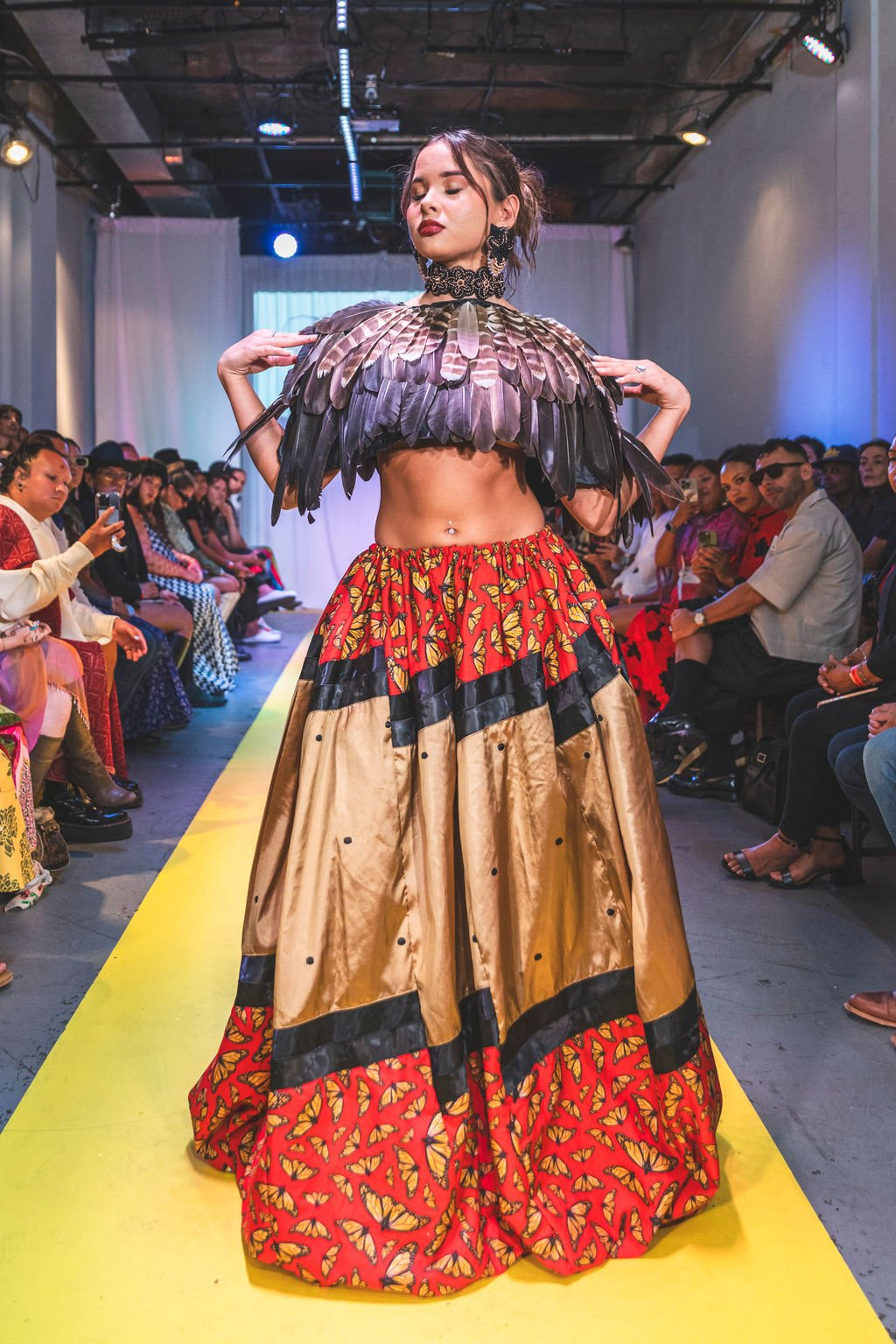 Tina Bradley (Haudenosaunee) of Queena Ribbon Designs presented a visual narrative of motherhood and femininity. Her collection featured ensembles made of Teton Trade Cloth fabrics and suede. A stunning feathered cape symbolized protection while a skirt with monarch butterfly graphics represented transformation and the sacred journey of life.
