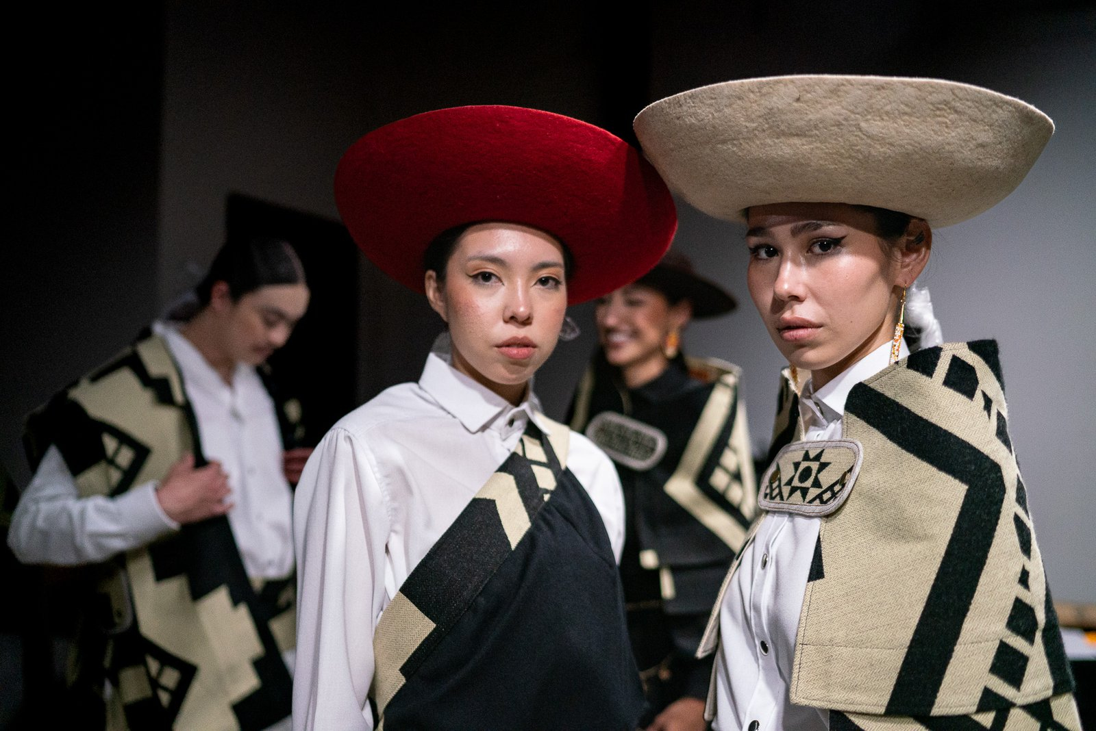 Kino Arcentales (Kichwa) of Toronto-based Pacha Indigenous Art Collection showcased a standout collection of women’s and men’s apparel made from cotton-acrylic blend fabric and leather. The designs featured structural jackets, capes, skirts, and ponchos embellished with South American graphics layered in and out of asymmetrical separates. According to Pacha, the black and white colors of the collection represent duality which is rooted in Andean cosmology: “They are opposites that work together.”